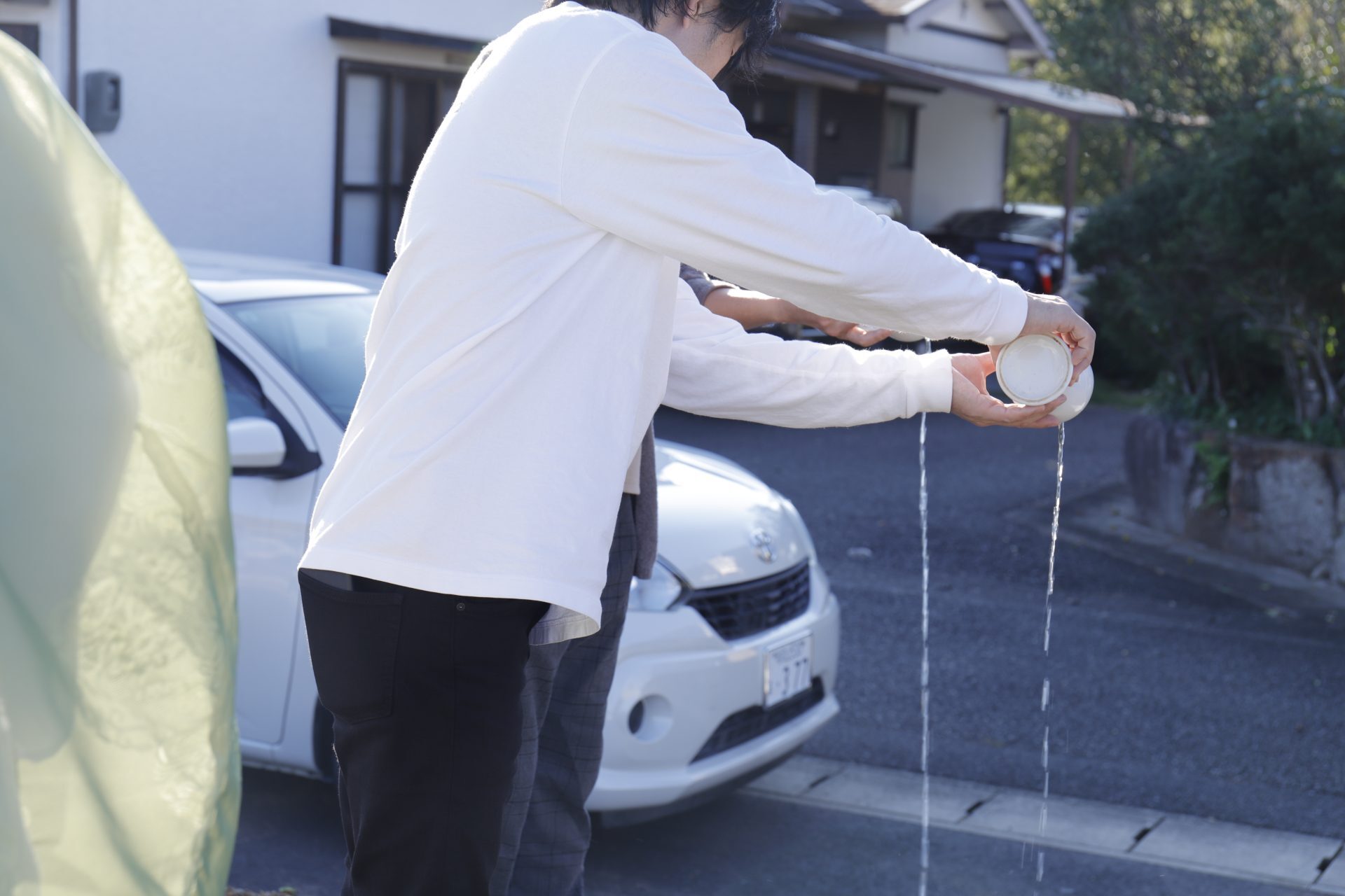 土地の四方と中心を巡り、日本酒や塩などでお清めします。